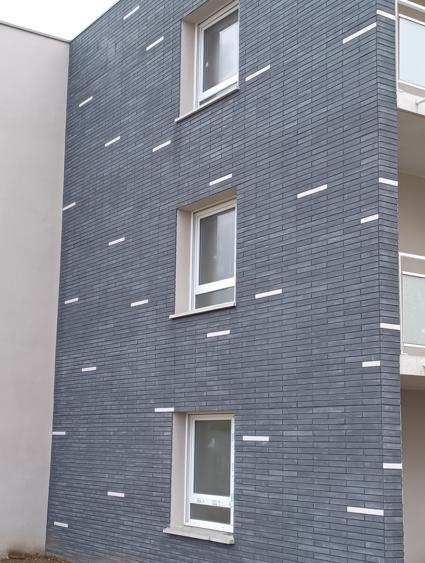 À Val-de-Reuil, la résidence Chaussée de Léry affirme une écriture architecturale contemporaine grâce à l’association des teintes Mica et Gris ardoise en BETOBRIKETTE®. Le contraste subtil entre clarté et profondeur rythme les façades et souligne les volumes.